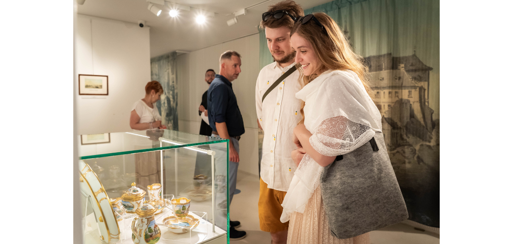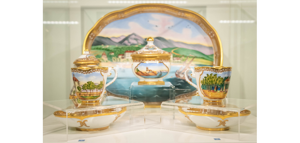 A bálok és a bencés kézben lévő fürdőtelep sokrétű történetének Balatonfüred, Tihany és ezek környéke ad bájos színteret, amelynek részletei nem csupán a vedutákon és képeslapokon köszönnek vissza, hanem egy egyedülálló kávéskészlet mesébe illően idilli, miniatűr ábrázolásain is. Az utolsó teremben kiállított kétszemélyes, úgynevezett tête-à-tête készlet eredetije az 1860-as években készült Fischer Mór porcelángyárában, amelyet ma Herendi Porcelánmanufaktúraként ismerünk.