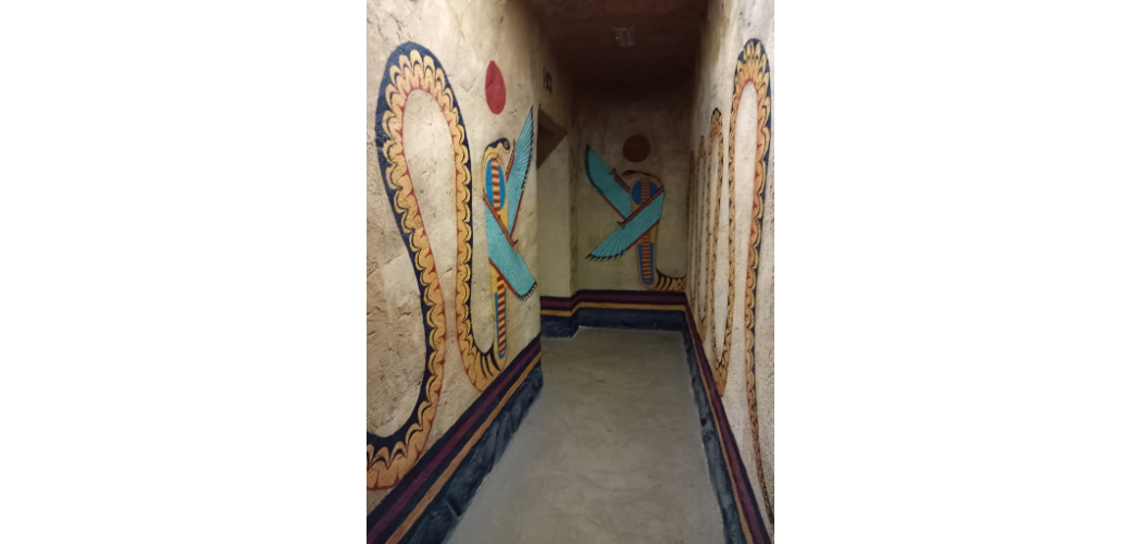 A kiállítás elején egy kanyargós folyosóból egy főúri (elit) sír mintájára kialakított terembe jutunk. Az ókori Egyiptomban a temetkezési helyszín két részből állt: egyrészt maga a sír, ahová a bebalzsamozott testet és a temetkezési felszerelést helyezték; másik része a kultuszkápolna, ahol a halotti áldozatok bemutatása és a halotti kultusz ápolása történt. A sír lezárása után tíz naponként az elhunytnak italáldozatot (libáció) mutattak be.