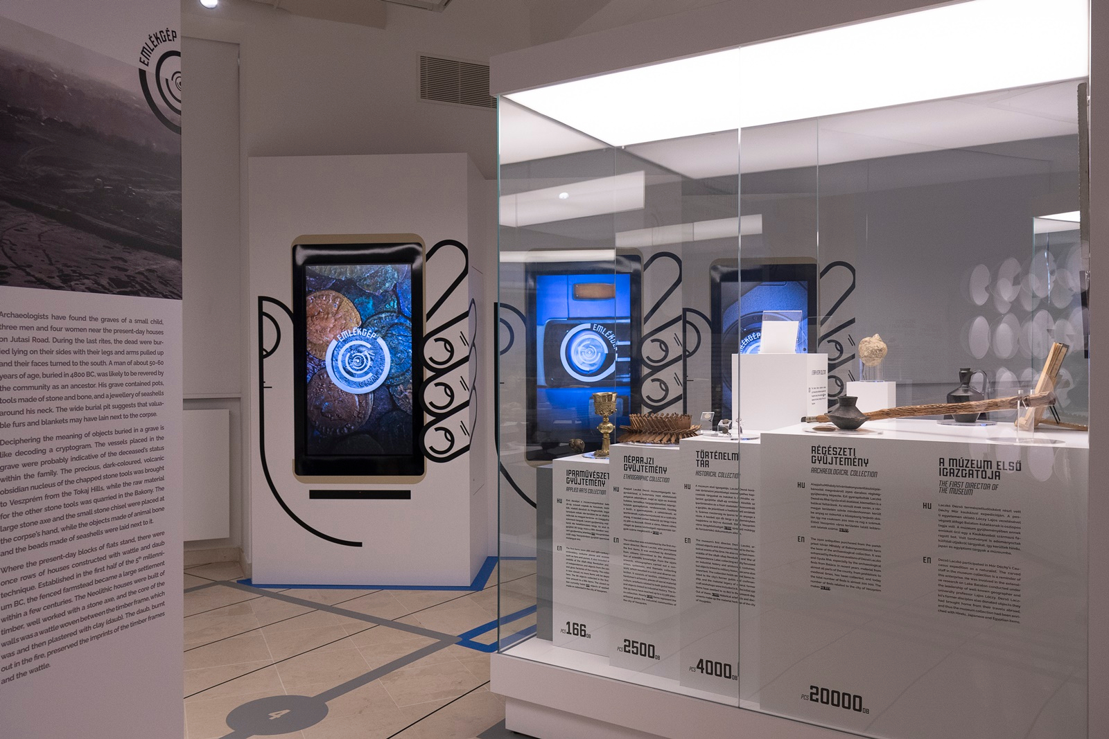 Az Emlékgép a legnagyobb kihívással eredményesen megbirkózott: a gazdag gyűjteményt sikerült négy, jól értelmezhető – az idő fogalmára felfűzött – témacsoportra bontani, amelyek segítségével folyamatosan fenn tudja tartani az érdeklődést. A Régészeti idő, Történeti idő, Közösségi idő, Személyes idő témakörök – falra ragasztott időszalagokkal – látványosan értelmezik, hogy az adott egység évmilliókat vagy pusztán évtizedeket ölel át. Színkódok, számok és a padlón futó ösvények segítik az egyre szűkebb időintervallumot feldolgozó tematikák egymás utáni bejárását.