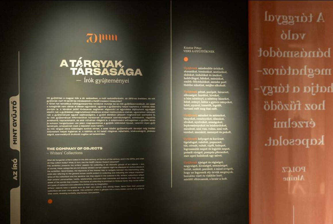 AZ ÉV KIÁLLÍTÁSA 2025 díjat október 21-én adják át a Petőfi Irodalmi Múzeumban. A Pulszky Társaság 2010-ben alapította a címet, mellyel évről-évre muzeális intézmények kiállítások megvalósításában megnyilvánuló tudományos felkészültségét, kreativitását, a közönséggel való kapcsolatteremtő képességét jutalmazza, egy múzeum állandó vagy időszaki, esetleg virtuális kiállítását kiválasztva. Idén két kategóriában folyik a megmérettetés: 10 millió forint alatti illetve feletti bekerülési költségű állandó vagy időszaki kiállítások pályáztak az elismerésre. A zsűri az előbbi kategóriából 5, az utóbbiból 9 pályázót választott a jelöltek közé. Amíg az eredmény a díjátadó konferencián kiderül, bemutatjuk mind a 14 finalistát. Először ábécé sorrendben a kisebb, majd a nagyobb költségvetésű kiállítást rendező intézmények kerülnek sorra. A 10 millió forint alatti bekerülési költségű pályázók közül következzen most a Petőfi Irodalmi Múzeum: A tárgyak társasága – írók gyűjteményei című időszaki kiállítása, mely 2024. május 8. és 2025. június 22. között volt látogatható!