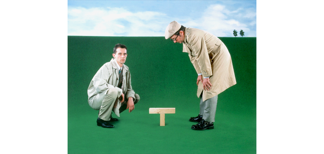 állnak össze egy képpé. A „T megtalálása” az 1999-es „T-betűt ültetek” folytatása lehetne: az első képen a művész a szorgos földműves szerepébe bújva egy nagyméretű, fából ácsolt T betűt próbál elültetni, a folytatásban pedig ballonkabátos nyomozóként társával együtt