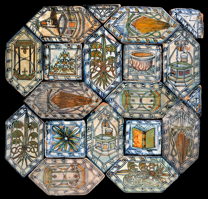 Fotó: Mátyás király palotájából származó, majolika csempékből álló padlórészlet, 15. század