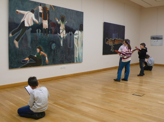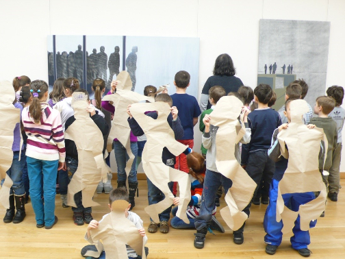 Fürjesi Csaba festőművész Virtuális lét c. (2013.03.23-05.25., Reök) kiállításán kezdtem foglalkozni ezzel a gondolattal, elsősorban azért, mert a művész egyéni kiállításán azonnal magával ragadott különös, Palackposta című alkotása. Korunk digitalizált világában, számítógépeinken keresztül, nap, mint nap, hosszan időzünk virtuális terekben, ahol számtalan képzeletbeli világ látványát észleljük, be- és kilépünk onnan, automatikusan közlekedünk valós és látszólagos terek között. Milyenné válhat az ember ezen átjárások által? Meg tudja-e tartani egyéniségét vagy egy nagy színpad személytelen szereplőjévé válik. Legfőképp, ezek a kérdésfelvetések szűrődtek ki számomra az alkotó képi világán át. A felvetés fontos, ezért itt, a tárlaton, az eredeti művek előtt, egyértelműen kínálkozik a helyzet, hogy művészetpedagógiai alkotómunkával, látványosan is emlékezetessé és érthetővé tegyük a művész érzékeny képi közléseit. A célom az volt, hogy Fürjesi bravúros technikával létrehozott festményüzeneteinek meghatározásairól, mindenképpen egyik jelentős műve előtt hozzunk létre egy színpadszerű jelenetet, reagálva adott alkotás kompozíciójára is. Különböző testhelyzetekben körberajzolták társaikat a gyerekek, majd kivágták a formákat és javaslatomra maguk elé tették azokat. Van, aki háttal áll, van, aki szemben, de a feloldódó egységes felületek mögött egyéniségek rejtőztek. Kifejezetten a valóságos és a virtuális tér közti létezés egészséges mértékére szerettem volna felhívni figyelmüket. A fotó, mint közvetítő médium, megőrizte a vissza nem térő pillanatot.
