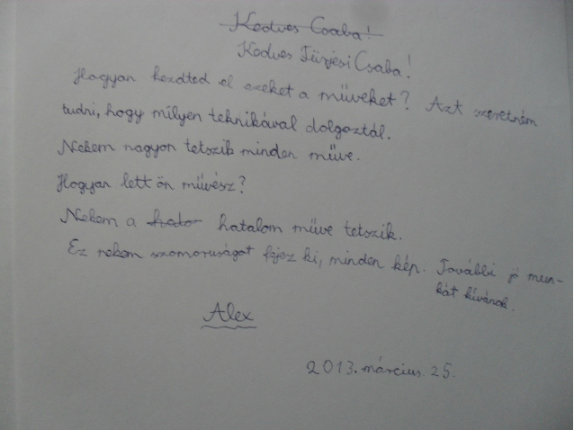 Ígéretem szerint, eljuttatom mindegyik írást a művésznek és jómagam fogom visszajuttatni a művész válaszait. Most ebben a formában vesszük fel a kapcsolatot az alkotóval. Mivel az osztály pedagógusa példaértékű hozzáállással, gondoskodással hozta tanítványait minden kortárs kiállítás múzeumpedagógiájára éveken át, ezért a gyakori találkozás miatt a válaszidő, mint tényező, fontos szempont volt számukra.
