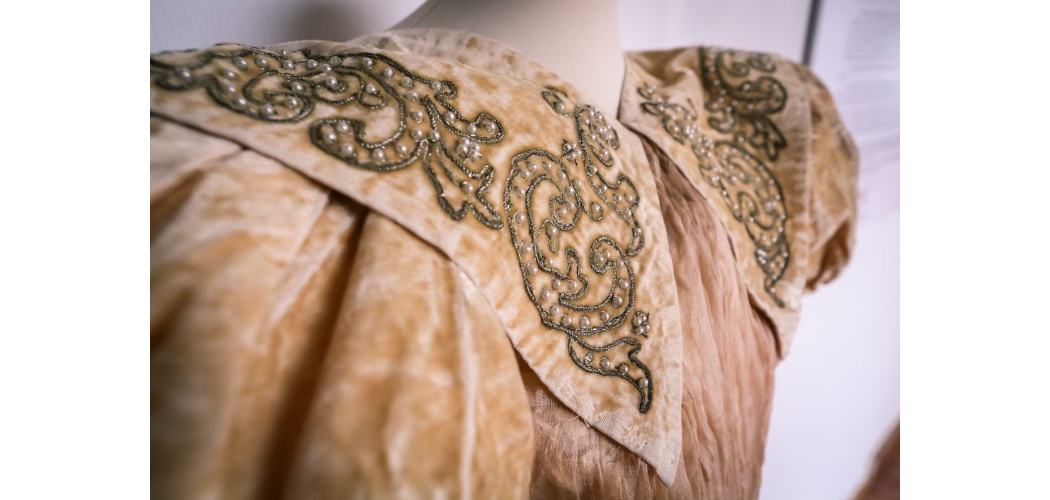 A barackszínű selyemdamasztra dolgozott muszlinból és bársonyból készült báli ruhaderék, vagyis ruha felsőrész erősen testhez szabott, 11 fűzőacéllal merevített – magyarázta.