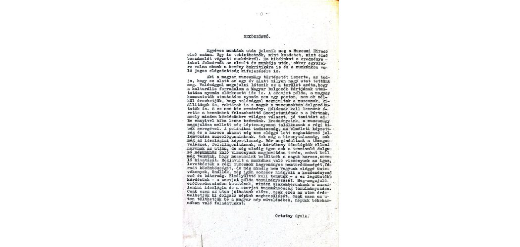 Az előzőre egyértelmű példákat találunk az első évfolyam első számában Beköszöntőt jegyző Ortutaytól vagy – később és több ízben is, a vele rivális – Pogány Ödön Gábortól: „Eredményeink, a múzeumügy megújulása mellett még lépten-nyomon találkozunk a régi hibák seregével. A politikai tudatosság az elméleti képzettség és a harcos akarat még nem eléggé lett meghatározó jellemvonása muzeológusainknak, sok még a bizonytalanság, sok még az ideológiai képzetlenség.” Vagy: „A múzeumok dolgozóit el kell töltse a nép határtalan szeretete. Ezek szakmai hűségét, hivatásérzetét át kell fűtse a szocialista hazafiság érzése az egész nemzet ügyért való munkálkodás felelőssége. Tudományos feladatainkhoz való szocialista viszonyunk kialakításával igyekezzünk méltóvá lenni szocializmust építő dolgozó népünkhöz, amit Nagy Pártunk második kongresszusa anyagának beható tanulmányozásával is továbbfejleszthetünk. Vigyük harcba a múzeumokban összegyűjtött nagy nemzeti értékeket a szocializmus győzelméért.”