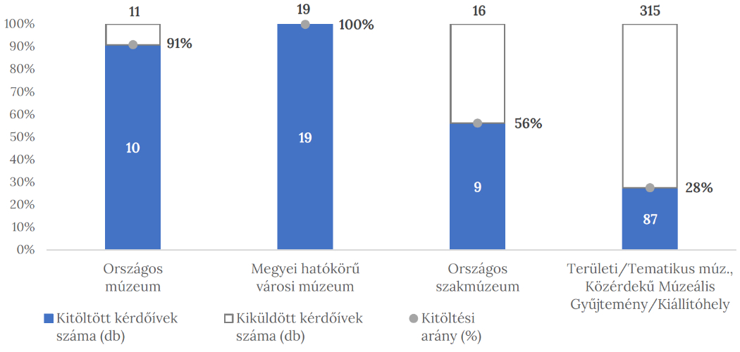 Az 1616 múzeumi alkalmazott, a 2019. évi kulturális statisztikai adatok alapján a múzeumokban dolgozó 7135 fő teljes- vagy rész munkaidős foglalkoztatottnak a 22,65%, ez nagy érdeklődést és kitöltési hajlandóságot mutat. A konkrét e-mail címre kiküldött kérdőívek esetében pontosan megállapítható a kitöltési arány, a munkatársak részére készített online, mindenki által elérhető kérdőív esetében, csak becsült számmal dolgozhatunk.