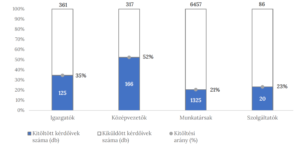 A válaszadók nemére, életkorára, végzettségére vonatkozó adatokból látható, hogy a női munkatársak a kitöltésben aktívabbak voltak, ahogy életkor szerint a 36-45 éves korosztály. Az adatot szolgáltatók 82%-ban rendelkeznek felsőfokú végzetséggel.
