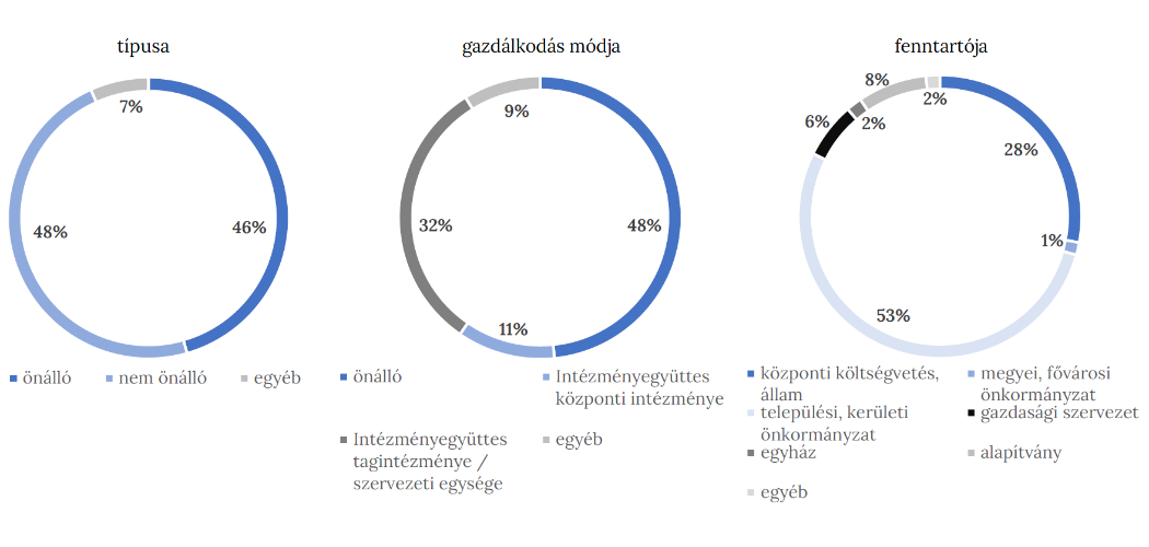 A fő/igazgatói kérdőívekben az általuk irányított múzeumra vonatkozóan is feltettünk kérdéseket. A múzeumok közel fele önálló, míg 43% intézményegyüttes része és annak vagy központi egysége (11%) vagy tagintézménye (32%). Gazdálkodásukat tekintve 46% önálló és 48% nem önálló. Az intézmények több mint fele (53%) települési vagy kerületi önkormányzat, míg 28% állami fenntartása alá tartozik. 8%-nak alapítvány, 6%-nak pedig gazdasági szervezet a fenntartója.