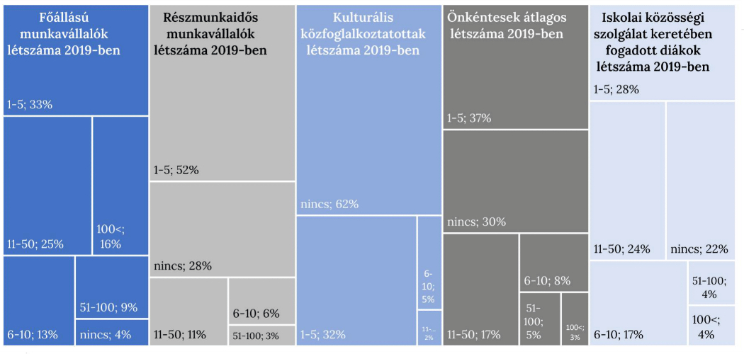 A foglalkoztatási adatokra is rákérdeztünk, így a főállású és részmunkaidős munkavállalók, a kulturális közfoglalkoztatottak, az önkéntesek és az iskolai közösségi szolgálat keretében fogadott diákok létszámára.