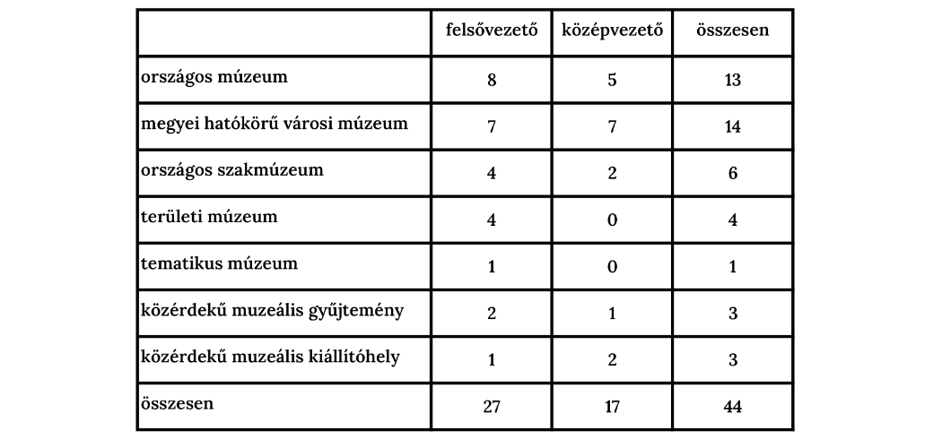 Mélyinterjúkra felsővezetőket és középvezetőket kértünk fel, a kiválasztásuknál szempont volt, hogy minden múzeumi típus képviselje magát. A felkért 50 fő közül 44 múzeumi felső- és középvezetővel készült interjú az alábbi megoszlásban.