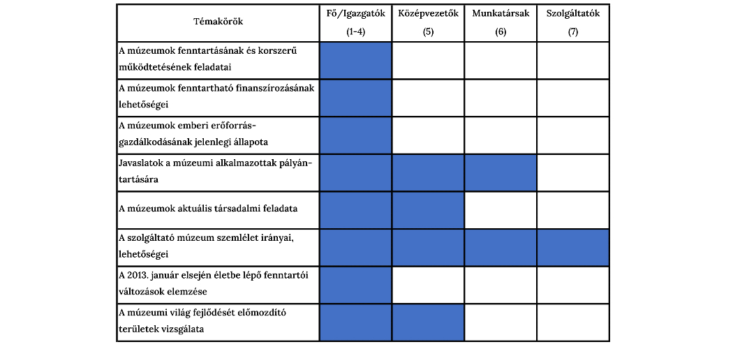 A kérdőív kitöltésében részt vevő főigazgatók és igazgatók listáját az EMMI Kultúráért Felelős Államtitkárság Múzeumi Főosztályától kaptuk, a középvezetők és a szolgáltatók elérhetőségeit a múzeum vezetőitől kértük be.