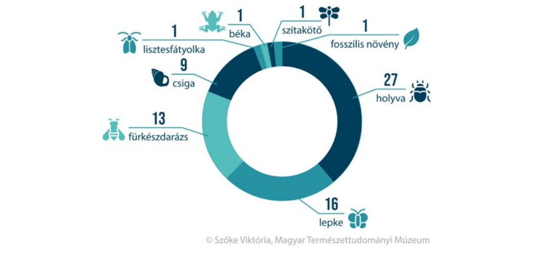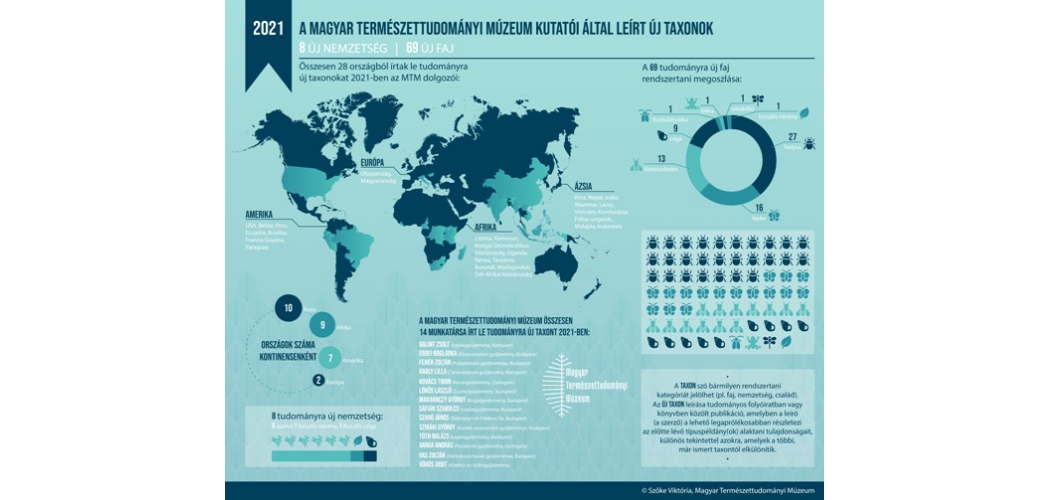 Összegző infografika a Magyar Természettudományi Múzeumban 2021-ben leírt tudományra új fajokról és más taxonokról (Készítette: Szőke Viktória, MTM)