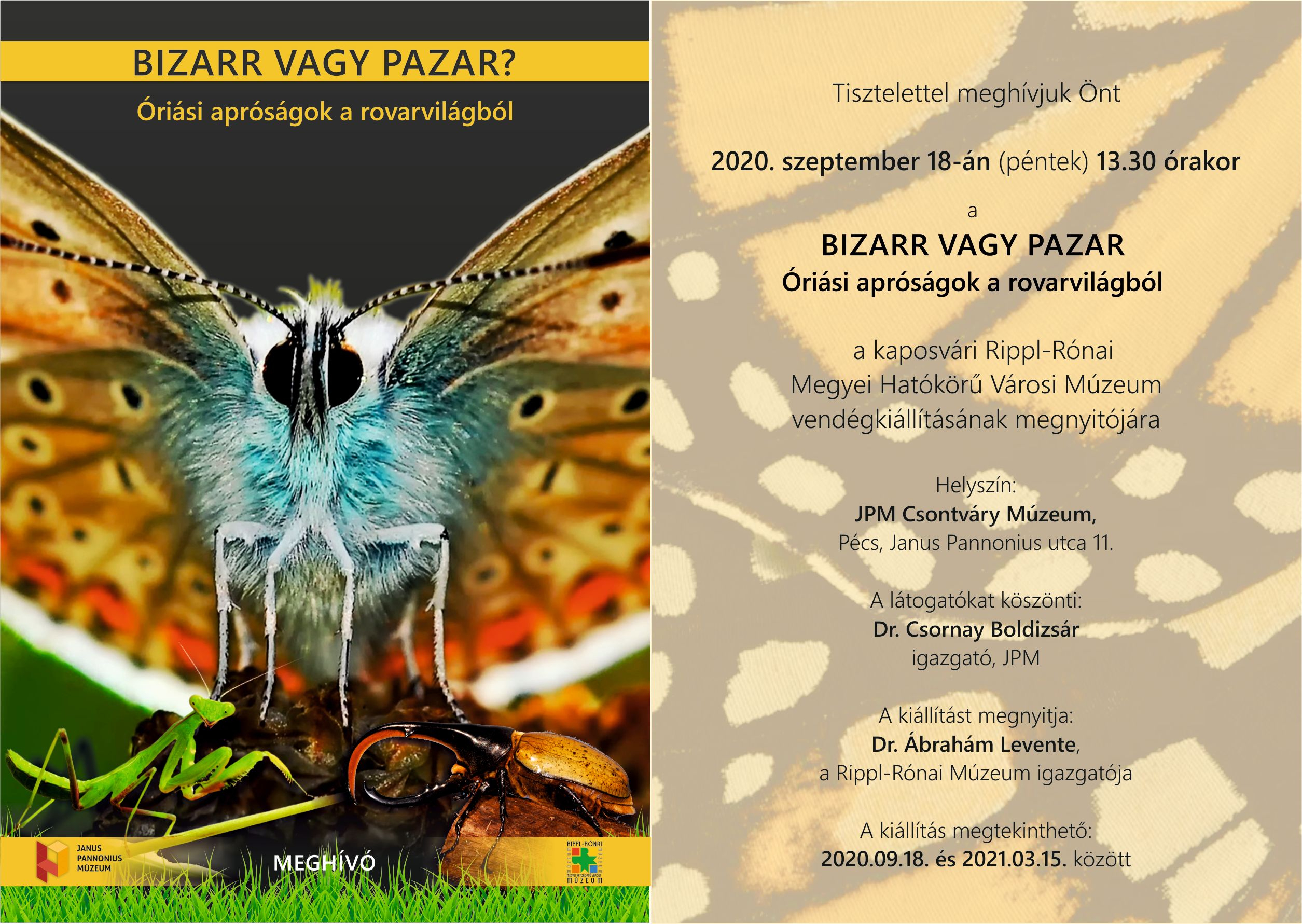 Bizarr vagy pazar? – e címet viseli az az új időszaki tárlat, amely a rovarok lenyűgöző világába enged bepillantást. A kiállítás megnyitója szeptember 18-án, pénteken 13:30 perckor lesz a Csontváry Múzeumban (Pécs, Janus Pannonius u. 11.).