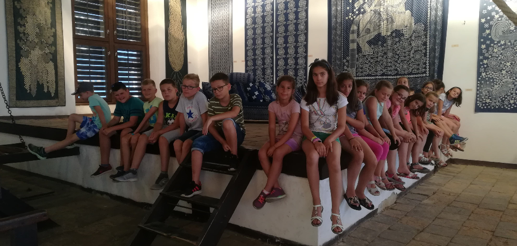 könnyebb a kicsiket a kézműves asztalokhoz ültetni. A múzeum profiljából adódóan minden turnus első napját a kékfestésnek szenteljük. Ebben az évben a kékfestés folyamatát élőben is megnézhették a gyerekek. Hétfő délelőtti szokásos programunk ismerkedés a múzeummal és egymással. Fontos, hogy a gyermekek minden nap hazavihessenek valamit, amit ők alkottak.