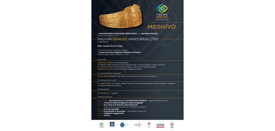 A Magyar Géniusz Program keretében megrendezett vándorkiállítás minden tekintetben újat és rendkívülit hoz létre. Eddig soha nem látott módon egy nagyszabású és reprezentatív tárlaton vonultatja fel a Kárpát-medence géniuszait, a vidéki muzeális intézmények múzeumaira, tájra, városra jellemző, legértékesebb és legkülönlegesebb műtárgyait. A tárlat 2023. március 31-től április 30-ig várja a látogatókat legújabb helyszínén, a szombathelyi Iseumban.