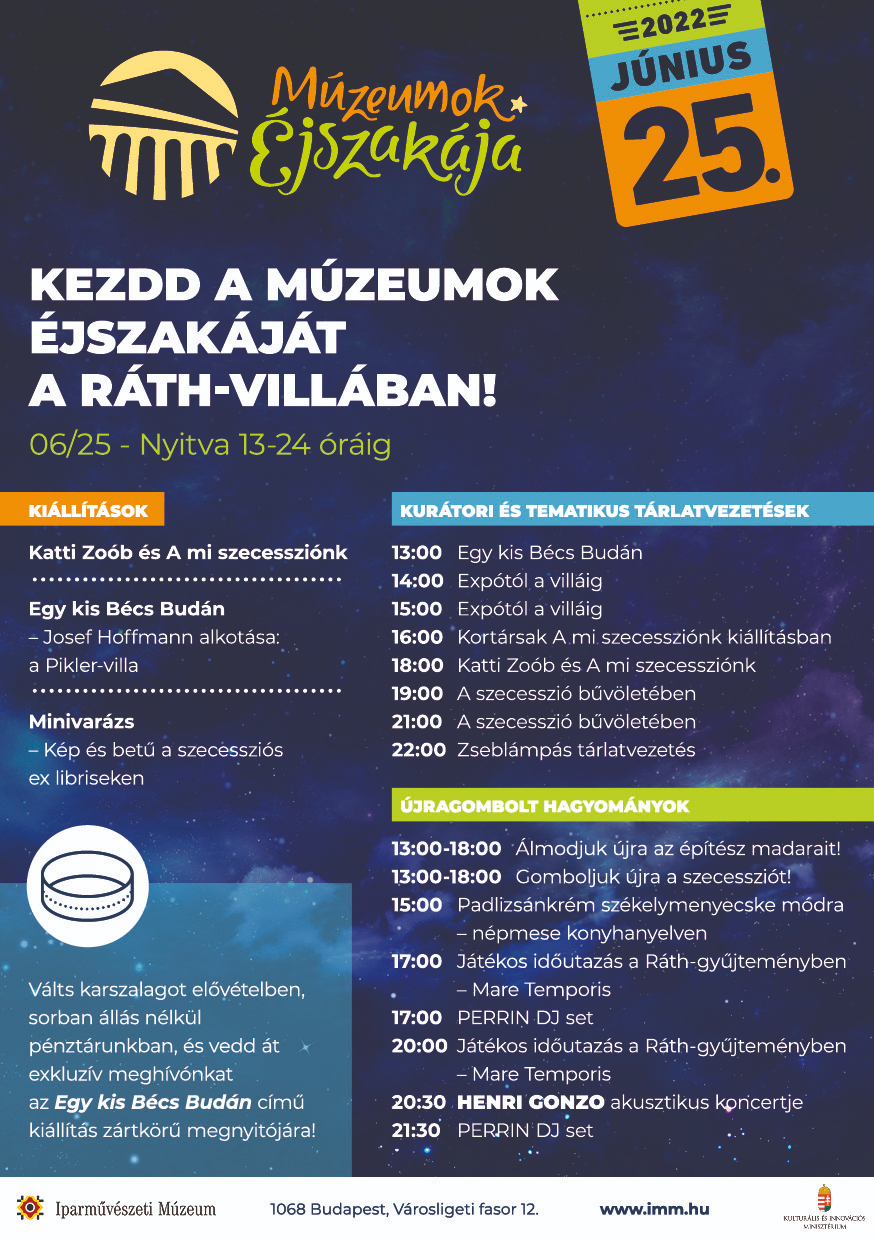 A Ráth György-villa szombaton 13-24 óráig várja a nagyközönséget számtalan tematikus tárlatvezetéssel, gyermekszínházzal, játékos időutazással, kézműves foglalkozással, Henri Gonzo akusztikus koncertjével és az alkalomhoz illő Perrin DJ szettel.