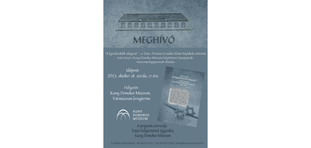 A Festészet Napja programját követően pedig október 18-án, 17 órától “A legszilárdabb talapzat” - a Tata-Tóvárosi Izraelita Elemi Népiskola története címmel Szűcs József a Kuny Domokos Múzeum helytörténeti kutatójának előadását hallhatják a Tata Vár lovagtermében.