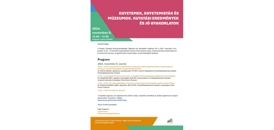 A Pulszky Társaság Múzeumandragógiai Tagozata sok szeretettel meghívja Önt a 2024. november 6-án, szerdán 12.00 és 13.30 között megrendezésre kerülő online szakmai napjára, melynek témája a felsőoktatás és a múzeumok viszonya, az egyetemisták múzeumképe, múzeumlátogatási szokásai.
