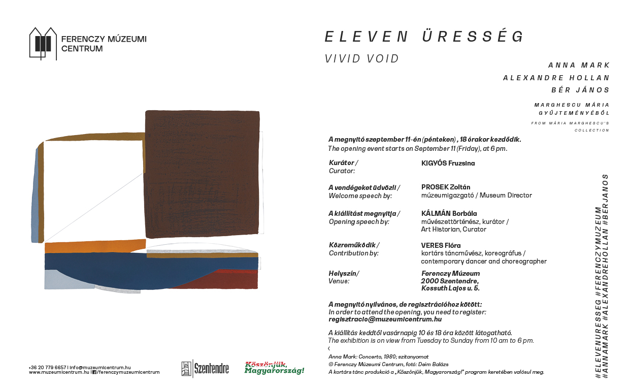 A járvány- és nyári szünet után szeptemberben új kiállításokkal és programokkal indítja újra életét Szentendrén a Ferenczy Múzeumi Centrum. Az intézményben megrendezésre kerülő Eleven üresség című kiállítás a gazdag Marghescu-gyűjtemény egy részét mutatja be három jelentős, magyar emigráns művész – Bér János, Alexandre Hollan, Anna Mark – munkáin keresztül. A műveket a tulajdonos a múzeumnak ajándékozza.