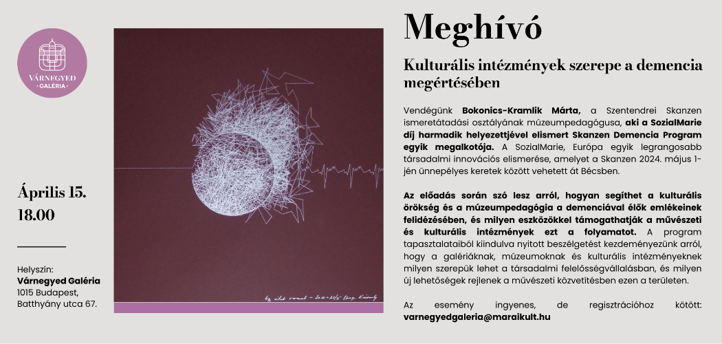 A kiállításához kapcsolódó Kulturális intézmények szerepe a demencia megértésében című program arra vállalkozik, hogy párbeszédet nyisson a művészet és a társadalmi felelősség határterületein. Az esemény vendége, Bokonics-Kramlik Márta, a Szentendrei Skanzen múzeumpedagógusa, a nemzetközileg is elismert Skanzen Demencia Program egyik megalkotója, olyan tapasztalatokat oszt meg, amelyek újraértelmezik a múzeumi és galériás terek szerepét a demenciával élők és hozzátartozóik életében.