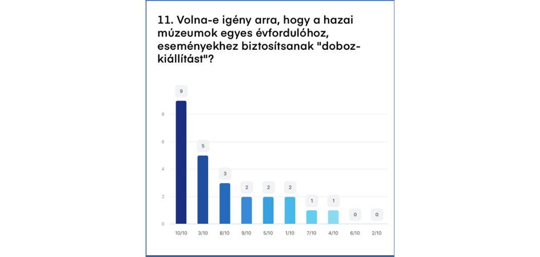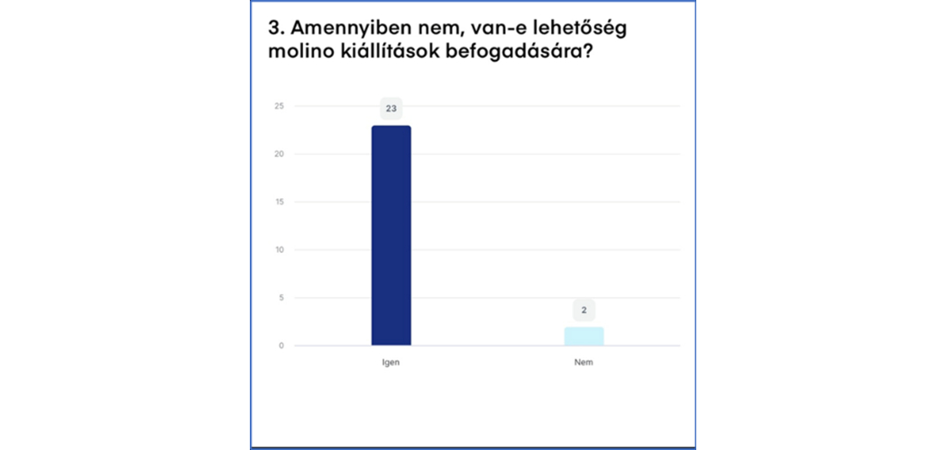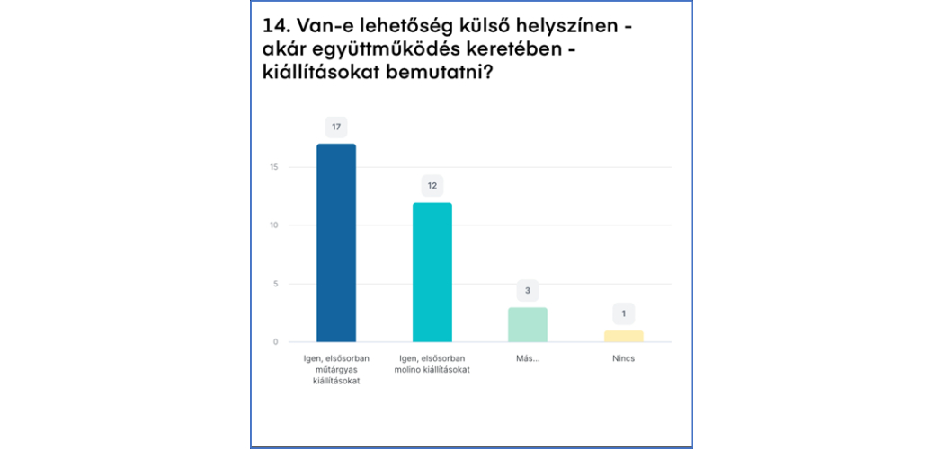 A kérdésekre adott válaszok alapján kijelenthetjük, szükség van hazai gyártású kiállítási tartalmakra/bemutatókra, a legtöbb intézet igényli az idehaza előkészített, közösen megkomponált színvonalas kiállításokat. Többen várnak műtárgyas, komoly kiállításokat, valamint azt is megfogalmazták, hogy nyitottak újszerű formák bemutatására (magyarul minden, ami nem molinó).