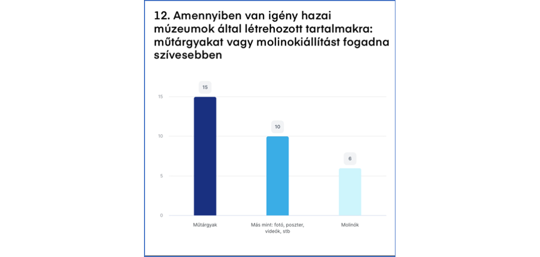 A 11. és 12 kérdésre adott válaszok szintén igen fontos információt tartalmaznak a múzeumok számára. Utóbbira több választ is lehetett adni.