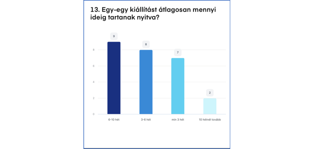 Idesorolom a 13. kérdést is, ami azt mutatja, hogy a kiállítások általában kellően hosszan tartanak nyitva. Ebből ellenben az következik, hogy megfelelő háttérinformációkkal egy-egy tárlat hasznosítására, promotálására volna lehetőség.