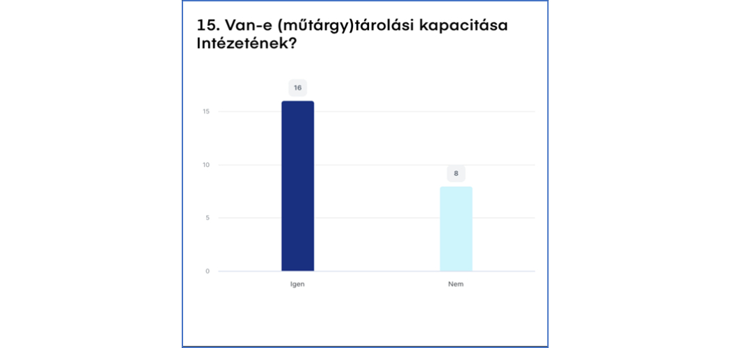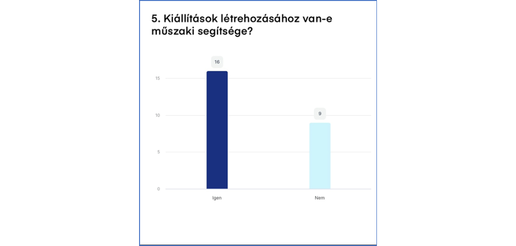 Nem elhanyagolható kérdés az sem, hogy a szándék mellett rendelkezik-e technikai háttérrel, infrastruktúrával egy adott intézet ahhoz, hogy befogadjon színvonalas, esetleg műtárgyakkal ellátott kiállítást. Ezekre a körülményekre kérdezett rá az 5. és a 15. kérdés. A válaszokból világosan kitűnik, hogy a kérdésben jelentősen eltérnek az intézetek lehetőségei.