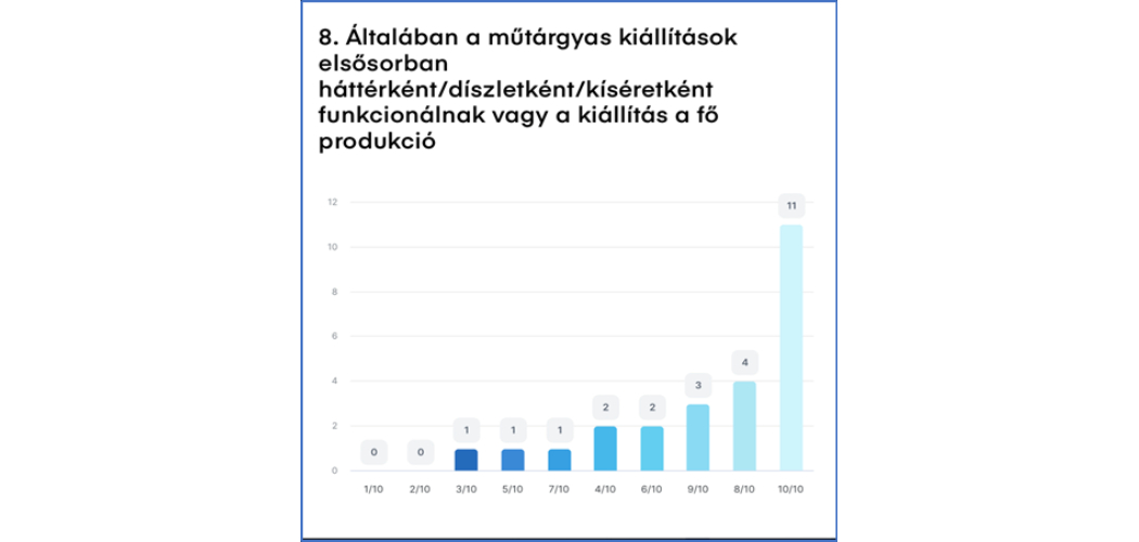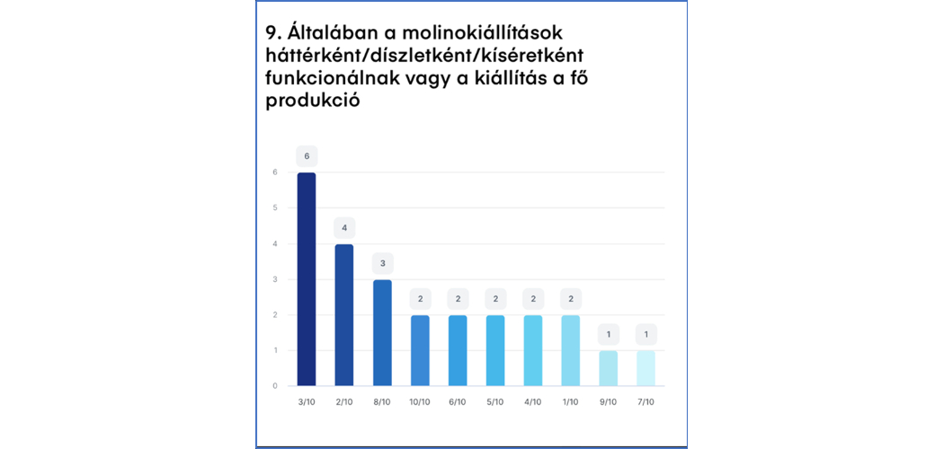 A soron következő 8. és 9. kérdések inkább technikai jellegű információt nyújtanak, a műtárgyas kiállítások önmagukban álló kulturális tartalmak, a molino-kiállítások sokkal inkább valamilyen kapcsolódó tartalmat (hátteret) adnak.