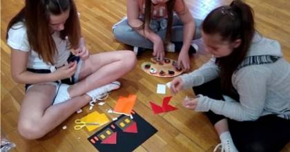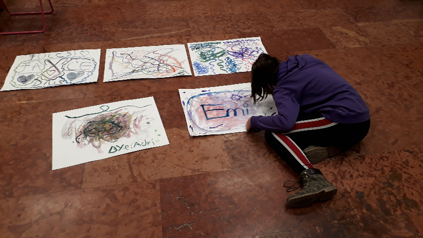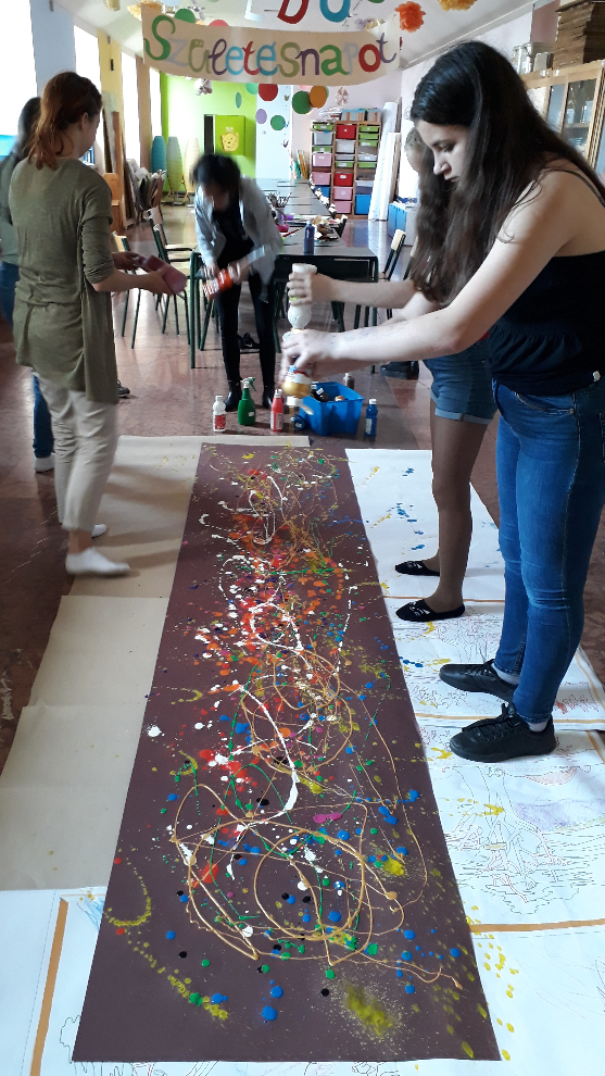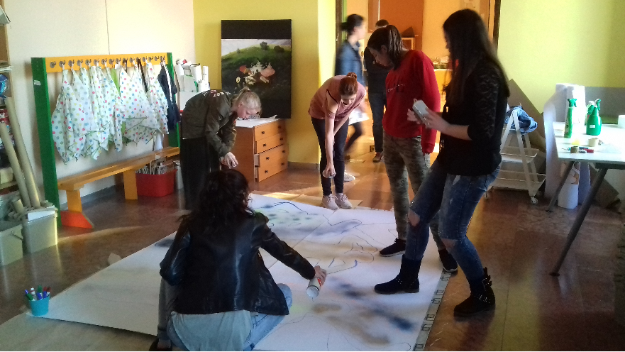 A műbefogadás és az alkotás kapcsolata is fontos motívuma volt minden alkalmunknak: az adott műtárgy kapcsán felvetődő gondolatokat, kérdéseket vittük tovább és dolgoztuk át az aznapi alkotófolyamatban. Az alkotómunka során vizuálisan friss, izgalmas és a lányok számára talán kevésbé ismerős, a művészetterápiához kötődő technikákat alkalmaztunk, pl. közös festékcsurgatás megdöntött rajztáblákon vagy a földön, egymás körberajzolása és szprével a felületek kitöltése, átlátszó fólián filctollal készülő rajz vagy színes tustechnika.