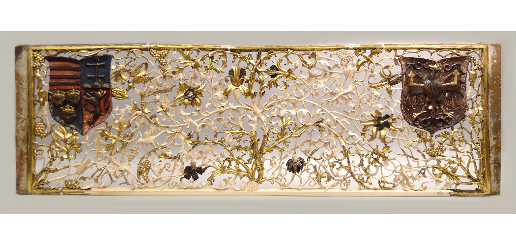 Különlegességnek számít a fiatornyokkal és lombdíszekkel gazdagon díszített, egykor több emelet magas – mára azonban csupán töredékes formában fennmaradt – oromzat, amelyet eredetileg a Fájdalmas Krisztus szobra fölött magasba törő toronysisakon feszülettel koronáztak meg. A virtuózan faragott, finom lombdíszekkel, szőlőfürtökkel és madarakkal ékes predella az oltáregyüttes egyik legpompásabb eleme volt. Kétoldalt fontos heraldikai díszek, címerpajzsok kaptak rajta helyet. A gazdagon aranyozott ünnepi nézetben, a finom faragású lombornamentikával díszített, nagy formátumú táblaképeken Keresztelő Szent János legendájának nyolc epizódja tárul a hívek elé. Az oltár legsérültebb részei az áttört ornamentális díszek voltak, az elemek sok helyen rekonstruckió által egészültek ki. Így készült el a predella középrésze, a nagy mérmű alsó lomb díszei és az oromzat számos elpusztult darabja.