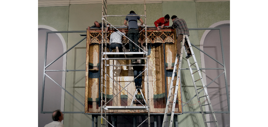 Az oltárszekrény felállítása a Nemzeti Galériában