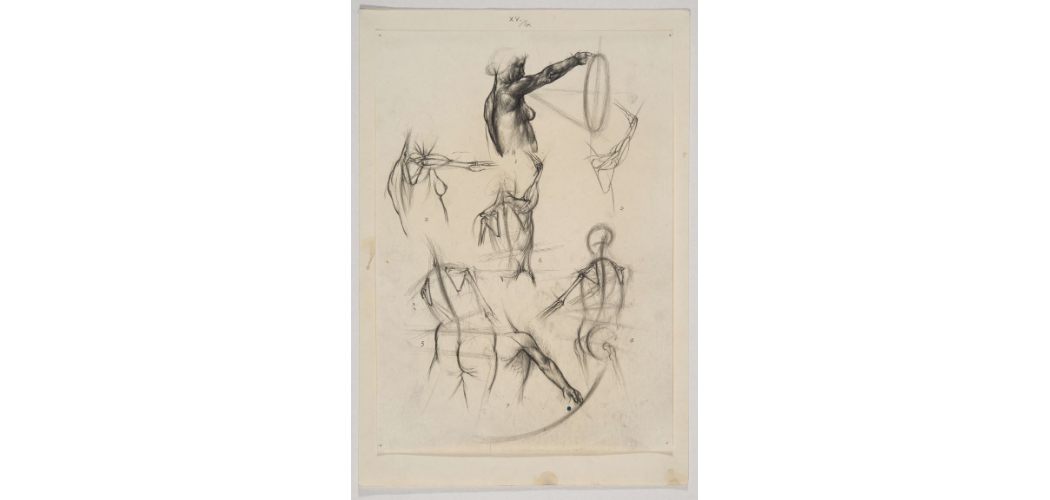 Barcsay Jenő: A kar és váll ízületek. 1953, ceruza, papír, 296x210 mm, MNG Grafikai Osztály, A fotó publikálva: Barcsay Jenő: Művészeti Anatómia. Budapest, Corvina Kiadó, 1953, XV. tábla