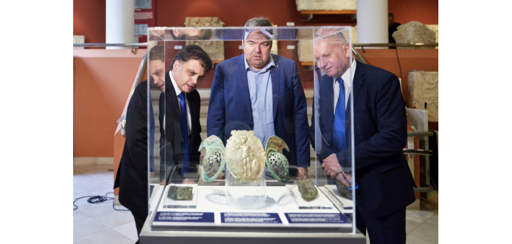 Latorcai Csaba, az Emberi Erőforrások Minisztériumának Közigazgatási Államtitkára, L. Simon László, a Magyar Nemzeti Múzeum Főigazgatója, valamint Borhy László, az ELTE rektora megtekintik a fejpáncélt