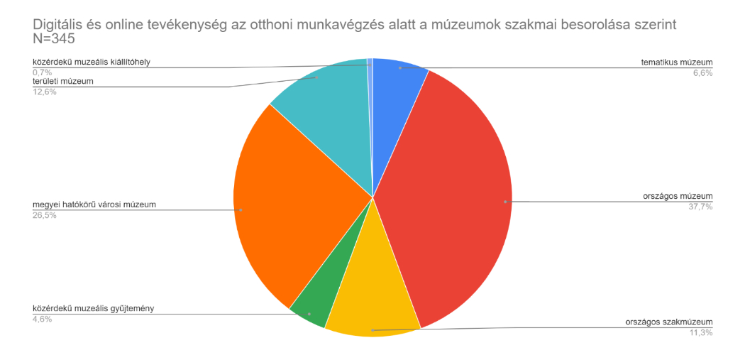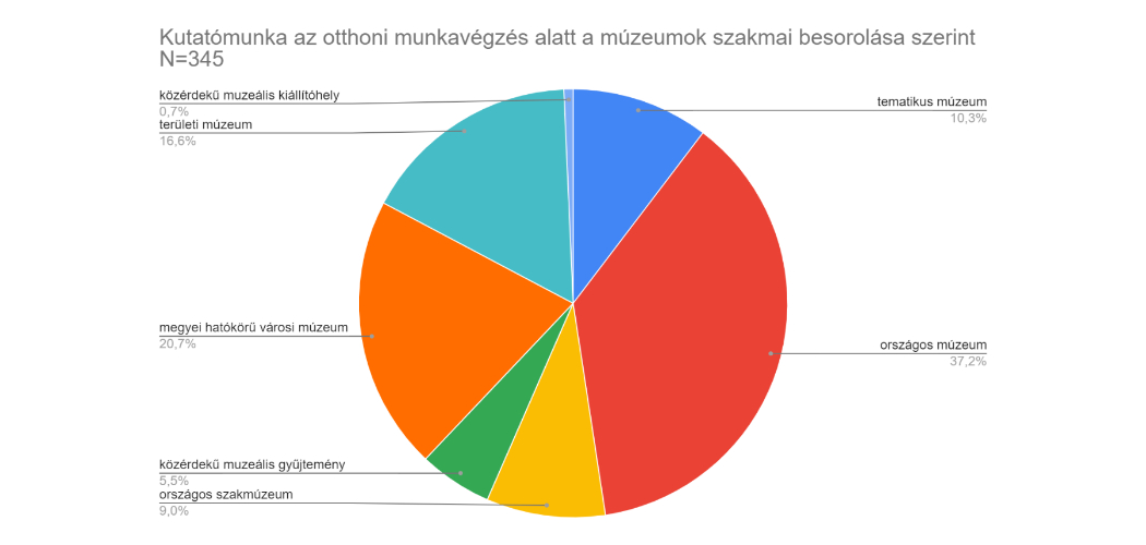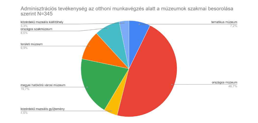 A három legnépszerűbb otthon végzett tevékenységet a különböző besorolású intézmények eltérő arányban adták ki munkavállalóiknak. Arányait tekintve legnagyobb volt a különbség az adminisztrációs feladatok terén, alapvetően az országos (46,7%) és a megyei hatókörű (19,7%) múzeumok terhelték ezzel a feladatkörrel a munkatársaikat. Érdekes a sorrend is a különböző intézménytípusoknál. Az országos múzeumoknál az adminisztrációt követték a digitális és online tartalmakkal való feladatok, és csak ezután következett a kutatómunka. A területi és a tematikus múzeumoknál a kutatómunka került első helyre, a vélhetően nagyobb megyei hatókörű és az országos szakmúzeumoknál pedig az digitális tartalomgyártás vezet, azután jött a kutatómunka, és csak a harmadik volt az adminisztráció.