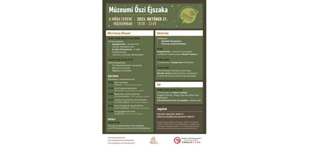 A Móra Ferenc Múzeum és kiállítóhelyei 2023. október 21-én 17 órakor zárnak, majd 18 órakor újra kinyitnak a Múzeumok Őszi Éjszakája programjaival.