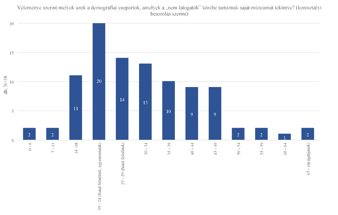 A legtöbb érdemi választ adó közül (összesen 38 fő) a túlnyomó többség a „nem látogató” demográfiai csoportokat leginkább korosztályi, illetve az ahhoz szorosan kapcsolódó oktatási háttér szerint határozta meg. Nem véletlen, hogy a legtöbben az egyetemisták és a fiatal felnőtteket jelölték meg mint „nem látogató” közönség (20 fő), majd a 25-30 közötti korosztály (14 fő). Szintén magas volt a fiatal aktív korúak, azaz a 30 és 35 év közöttiek megemlítése (13 fő). Utánuk a középiskolások, gimnazisták (14-18 éves korosztály) következtek 11 db említéssel, a 35 és 40 közöttiek 10 válaszban, a 45 és 50, valamint az 50 és 55 év közöttiek pedig 9-9 múzeumi vezető válaszában kerültek elő mint „nem látogató” demográfiai csoportok. A bölcsődések, óvodások, az általános iskolás korúak, valamint az 55 és 60 közöttiek, továbbá a nyugdíjasok (65+) mind csupán két válaszban kerültek elő. A 60 és 65 év közöttiek pedig egyetlen mélyinterjúban sem lett megemlítve a kérdésre adott válaszokban.