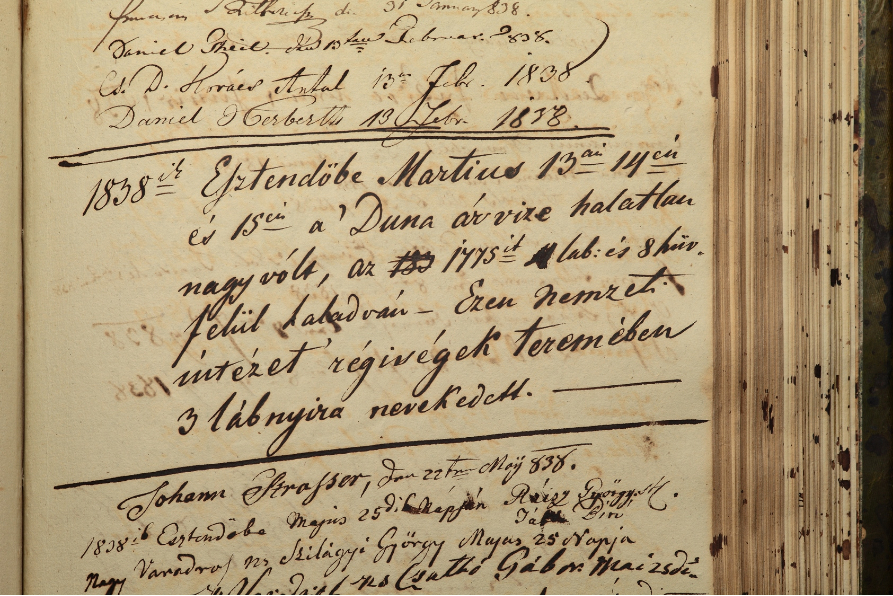 A Magyar Nemzeti Múzeum Régiségtárának árvízi bejegyzése, 1838 (MNM Központi Adattár, Múzeumtörténeti Gyűjtemény)