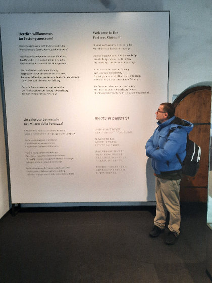 Salzburg, Festungsmuseum – könnyen érthető falszöveg német, angol, olasz és mandarin nyelven (fotó: Horváth Péter)
