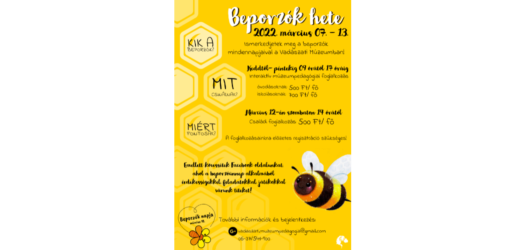 Első körben 2022. március 8. kedd és március 11. péntek között várjuk az óvodás és alsó tagozatos csoportokat a Beporzók ligája foglalkozásainkra 09 és 17 óra között. De, hogy ne maradjon le senki sem, 2022. március 12-én szombaton 14 órától családi foglalkozásra is várunk mindenkit szeretettel. Ezen a napon érdemes lesz ellátogatni a múzeum kertjébe is, ahol szorgos méhekként izgalmas keresőjátékra várjuk a családokat. A foglalkozásokra előzetes regisztráció szükséges!
