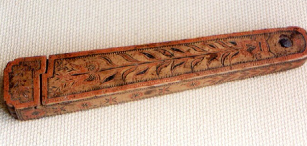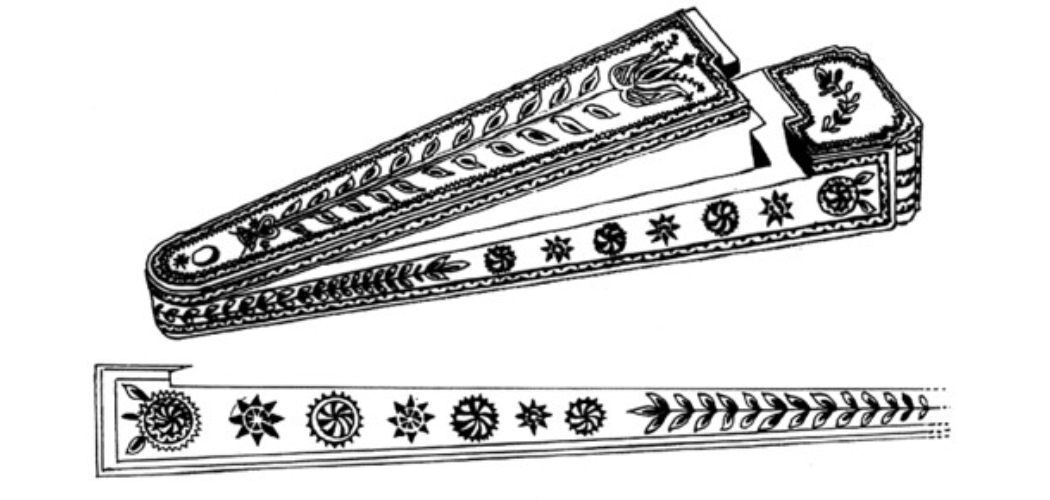 CSM HT 90.6.1.: Borotvatok. Lekerekített sarkú, egyik végén elkeskenyedő, hosszúkás fából készült tok. Félrehúzható fedele spanyolozott technikával vörös-fekete viasszal díszített tulipánokkal, csillagokkal, virágokkal. M: 23.5x4.5x2.9 cm