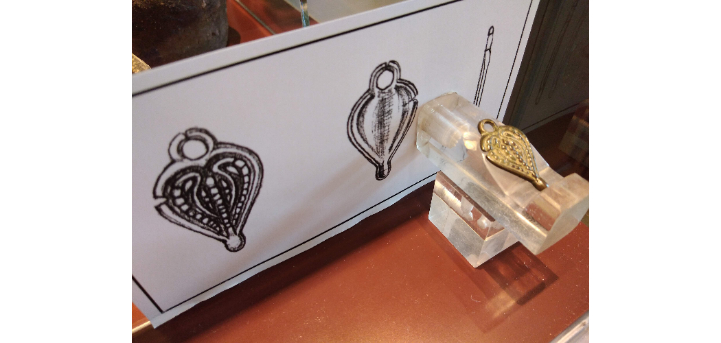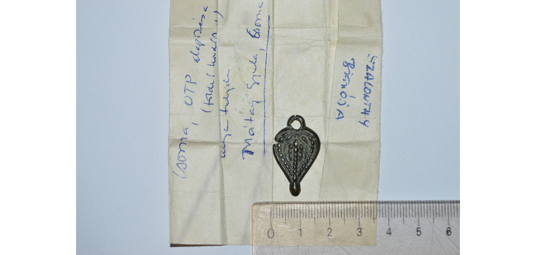 Lsz.n.: Kéttagú női ingnyakveret alsó, szív alakú tagja. Bronzból öntött, poncolt díszítésű. Szórvány. Honfoglaláskor, X/XI. század. M: 2.8x1.6 cm; v: 0.1 cm