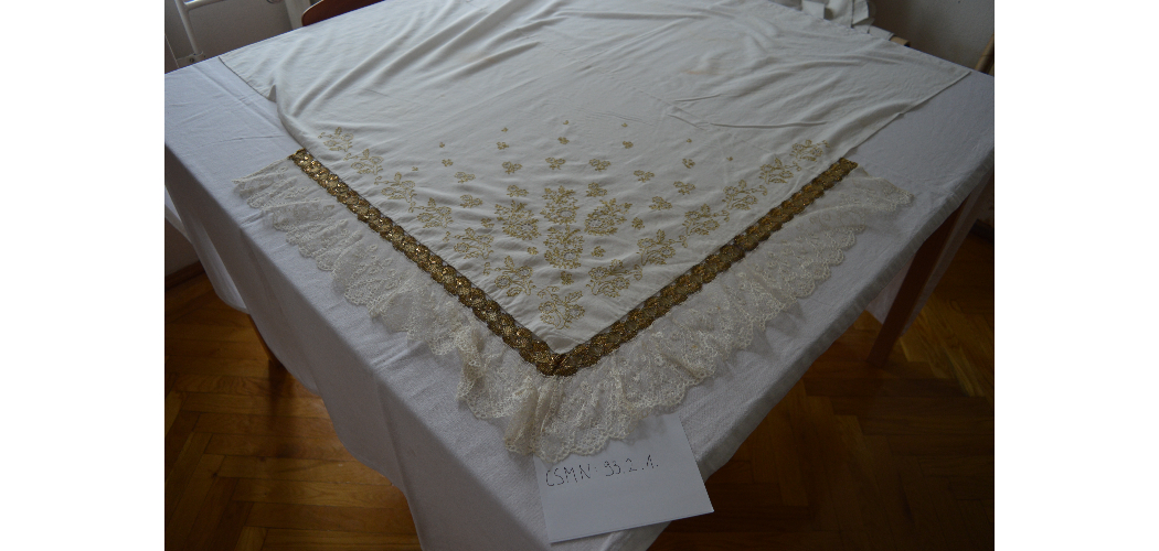 CsM-N 93.2.1.: Fehér batiszt alapra hímzett, aranyfonalas 4 forgórózsás motívumú menyecskekendő tüll -és aranycsipkével ellátva. M: 106x103 cm