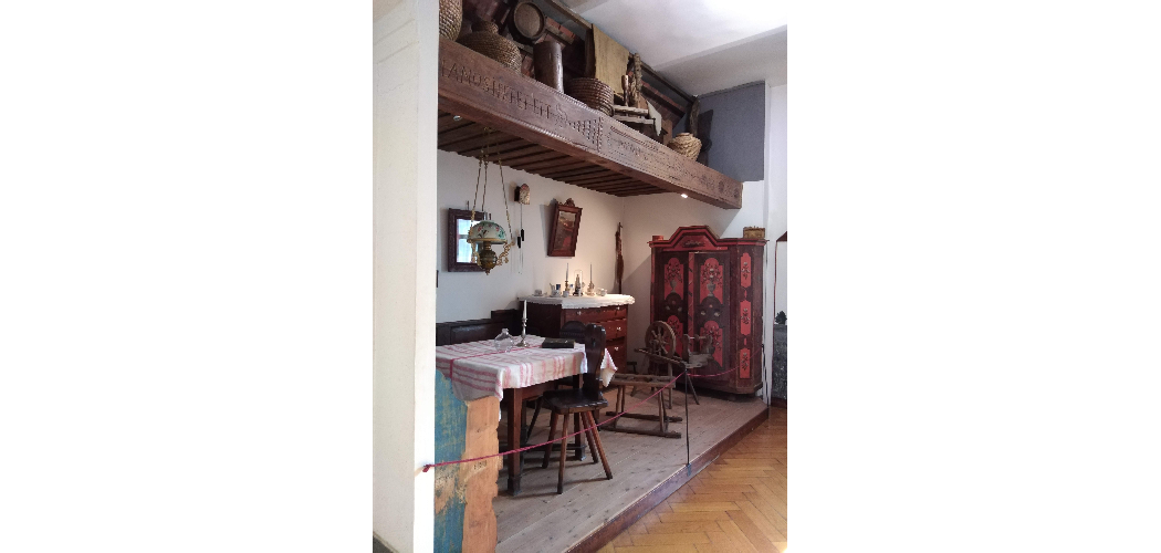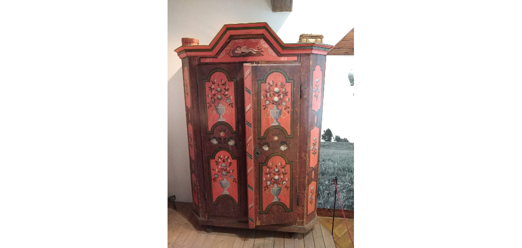 Az 1840-ben kiadott „Regélő” szerint a Rábaköz népének divatja szerint a tiszta szobában legalább egy tulipános almáriumnak lennie kellett. Ez az almárium, a mennyezetes ágyhoz hasonlóan cifrára volt festve Drinóczy György leírása szerint is. Az állandó néprajzi kiállításunkban látható tisztaszoba szekrénye első pillantásra beleillik e sorba, barna hátterű, korallpiros kazettáiban klasszicista stílusú vázákban fehér virágú csokrok láthatóak, a szekrény oldalán hasonló kialakítású, hullámos szárú virágok, zöld levelekkel. Zöld színű az oromzat díszítő sávja is, amely alatt a készítés éve olvasható finom tagolással, szinte indát idéző finom megjelenítéssel: 1818. Az évszám számai között a szögletes kiképzésű oromzaton a Kisjézus alakja jelenik meg, naiv népi ábrázolásban. A kisded dicsfényét a párna szegélye jelzi. Az emberek, de kiváltképp a szentek népi bútorokon való ábrázolása Magyarországon ismeretlen szokás volt. Ausztriában gyakorinak számít, ám nem a közeli, határmenti területeken, hanem Felső-Ausztriában. Vélhetően ott láthatott a megrendelő (a veszkényi Nyerges-család),vagy a mester hasonló darabokat, és próbálta azt az erősen katolikus vidéken meghonosítani. Megyei múzeumi gyűjteményeink darabjait szemlélve úgy tűnik, egyetlen próbálkozás, egy sikertelen kísérlet maradt.