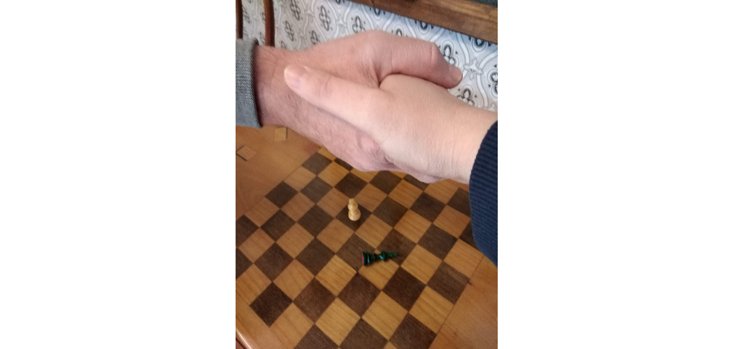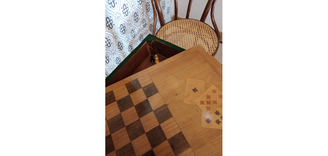 A sakkasztalka része volt a korábbi kiállítás polgári enteriőrjének, és beépült új helytörténeti kiállításunk kávéházi terébe is. Gondosan restaurált cseresznyefa asztal, intarziás mintázattal dominók és kártyák is feltűnnek a 8x8 mezős tábla két szélén. A tárgy Tóth Jenő, ismert századeleji polgár hagyatékából került a múzeumba 1996-ban. A Tóth-hagyaték jelentős részét teszi ki polgári gyűjteményünknek, számos irat, könyv, fotó, bútor, kisebb tárgyak emlékeznek a családra. Óhatatlan azonban a hiányérzetünk: hol vannak a bábuk, hogyan elevenedhetne meg a sakk?
