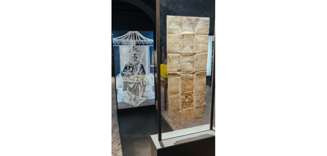A pinceszinti termek kronologikus rendben tárják fel az Apátság történetét az alapítástól napjainkig. A középkori terem tudományos részletességgel tárgyalja a Tihanyi alapítólevelet. Megismerhetjük mint nyelvemléket és mint történeti forrást, egy impozáns méretű érintőképernyő segítségével párhuzamba állíthatjuk az eredeti oklevél fényképét, a latin nyelvű átiratot és a magyar nyelvű forrást, miközben bármely szórványára rákattintva annak bőséges jellemzésével találkozhatunk. Számos oklevélmásolat segít felidézni az Apátság hiteles helyi tevékenységét, heraldikai magyarázatok mentén végigkövethetjük a címer változásait a kezdetektől napjainkig. A teremben megismerhetjük az Apátság középkori építéstörténeti szakaszait – ehhez izgalmas animációs film nyújt segítséget. A királyi kriptával közös falra vetítve illusztrációt látunk arról, hogy kortárs analógiák alapján milyennek is képzelhetjük el a középkori tihanyi kriptát.