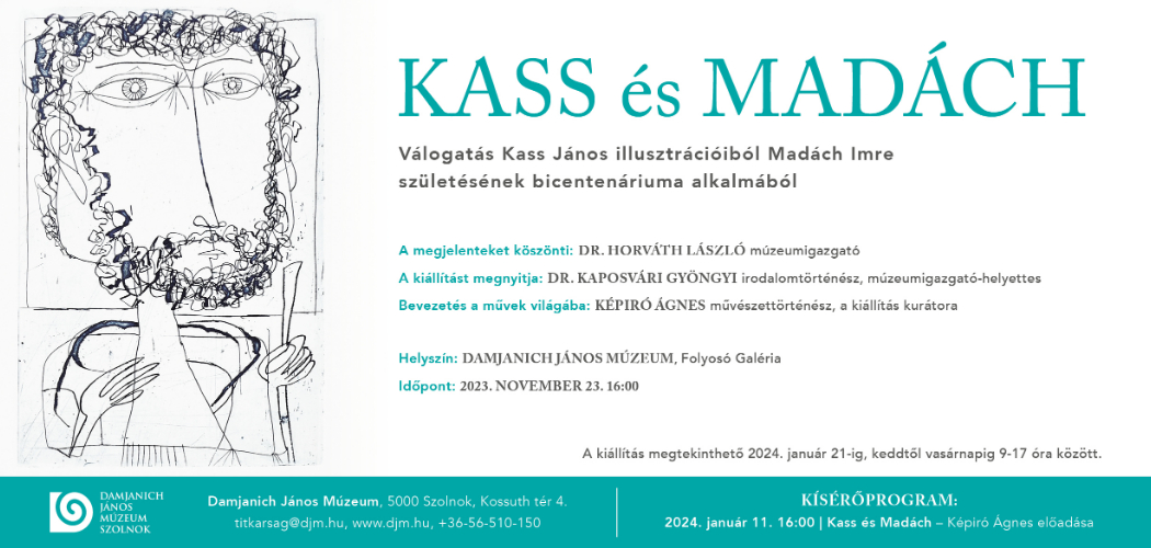 A Kass és Madách című kiállítást 2023. november 23-án 16 órakor Dr. Kaposvári Gyöngyi irodalomtörténész, múzeumigazgató-helyettes nyitja meg, és egészen 2024. január 21-ig megtekinthető lesz a múzeum Folyosó Galériájában. A kiállítás kurátora Képiró Ágnes, a Damjanich János Múzeum művészettörténésze.