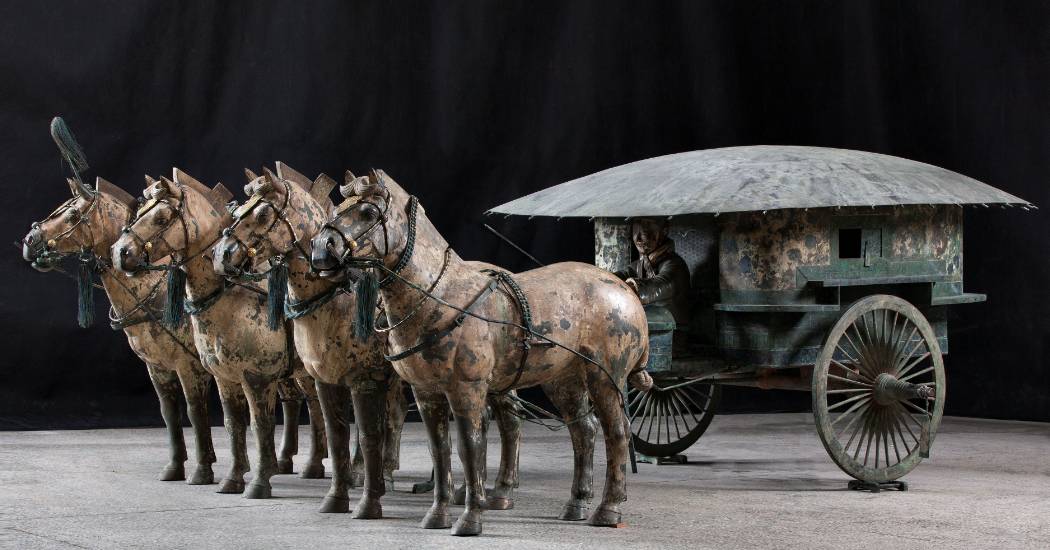 Csin Si Huangti nagy eltökéltséggel kutatta az öröklét titkát, amelynek különösen szép tárgyai, a túlvilágra vivő lovas kocsik is bekerültek sírjába, és most a budapesti kiállítás anyagába. A kiállítás középső nagy egységében megismerhetjük az első kínai császár sírkertjének felszínre hozott leleteit: ezek nemcsak hadserege valósághű katonái (előljárók, derékhadba tartozó gyalogosok, íjászok, kocsihajtó) és a korabeli hadviselés fegyverei, hanem vallanak az egységesülő birodalom működéséről, a mindennapi életről és a kormányzásról is.