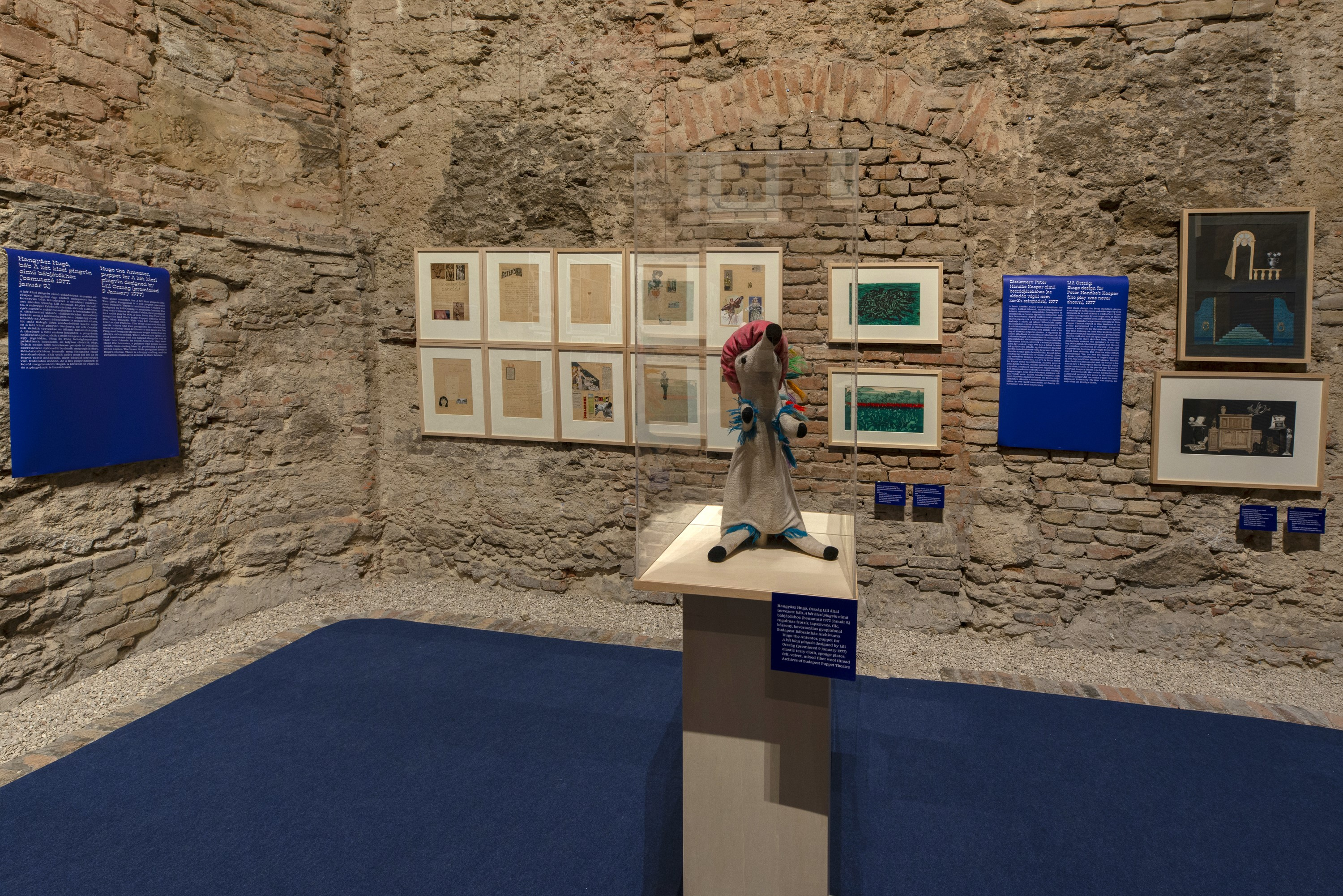 Kiállításunk helyszíne, a 18. századi templom az átépítéseknek, funkcióváltásoknak és a második világháborúban elszenvedett károknak a nyomait viselve romtemplomként, majd 1988 óta kiállítótérként saját történetében hordozza azokat a témákat, amelyek a festményeken is visszaköszönnek: építést és pusztítást, szakrális és profán egymásba játszását, a múltnak egymásra rakódó rétegeit, jelenlévő nyomait.